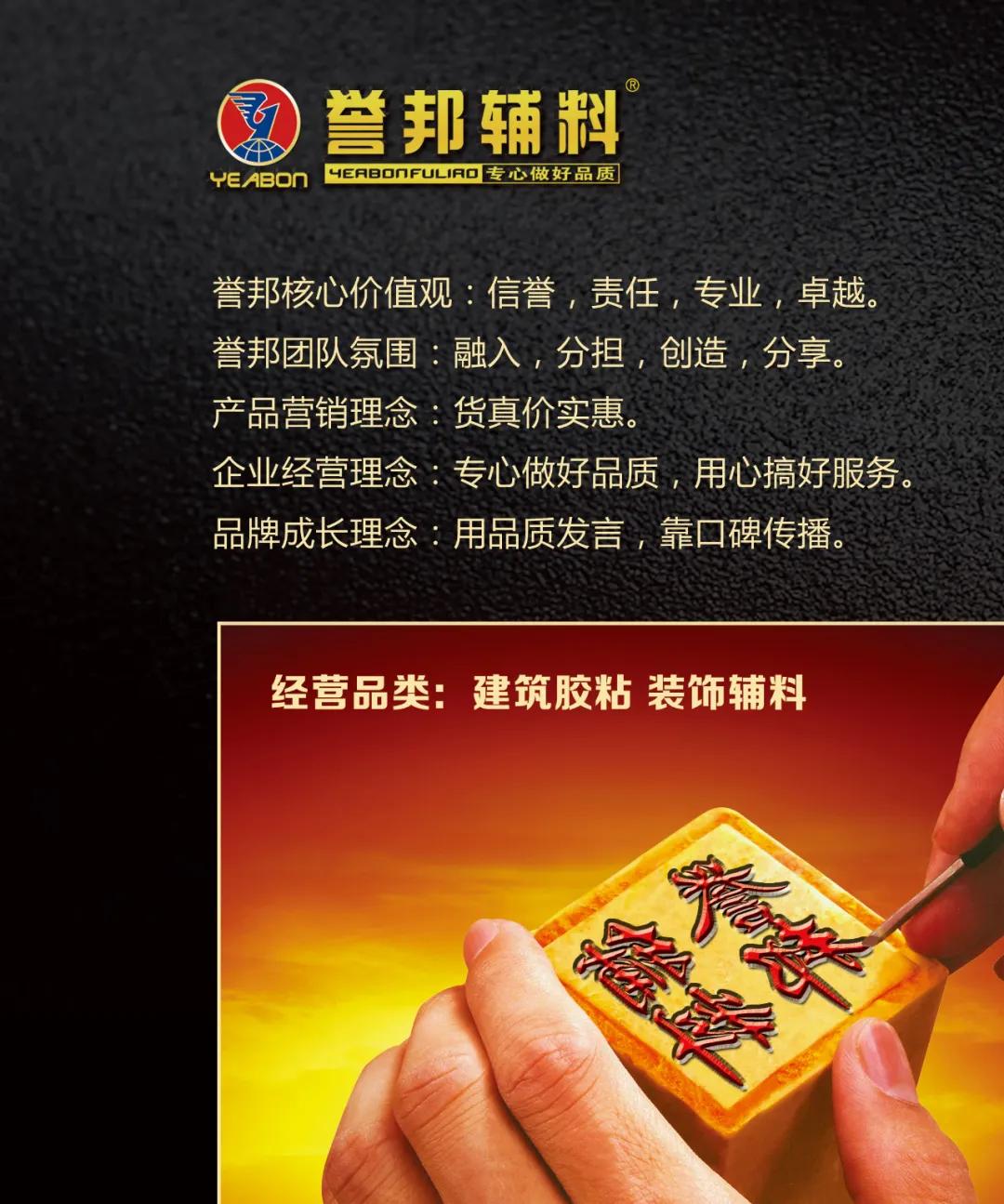 三,誉邦牌还是是装饰辅料的产品品牌。在华中、西南和国内很多区域,很多脍炙人口的辅料主流品牌都是誉邦牌的。如誉邦牌腻子粉系列,誉邦典范二合一墙固,誉邦凯旋网格布,誉邦典范白乳胶,誉邦典范真瓷胶,誉邦典范色浆,誉邦名匠滚筒,誉邦典范干砂等等。